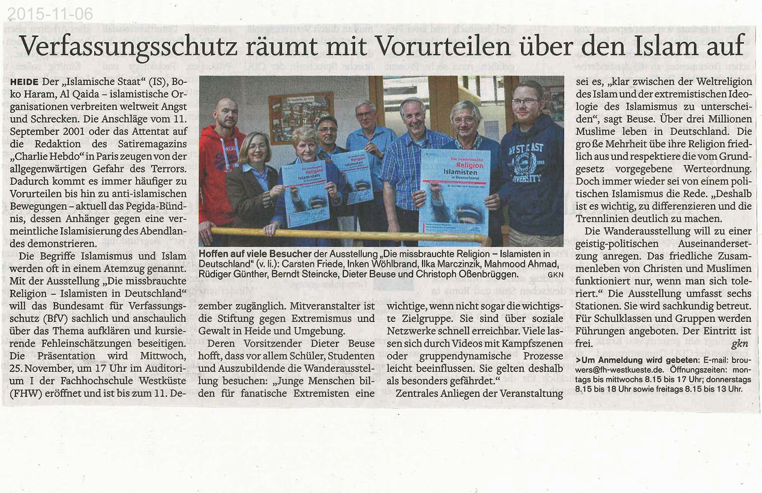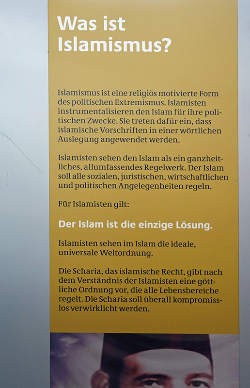 Eine Ausstellung des Bundesamtes für Verfassungsschutz, die in der Fachhochschule Westküste in Heide gezeigt wurde. Über 2000 Besucherinnen und Besucher haben sich die Informationen angesehen. Auch die Heider Muslim-Ahmadiyya-Gemeinde stellte sich mit uns auf die Seite der Aufklärung und konnte aus ihrer Gemeinschaft eine kleine Ausstellung als Ergänzung zeigen. Für die Studentinnen und Studenten war dieses Angebot ebenfalls von Interesse.